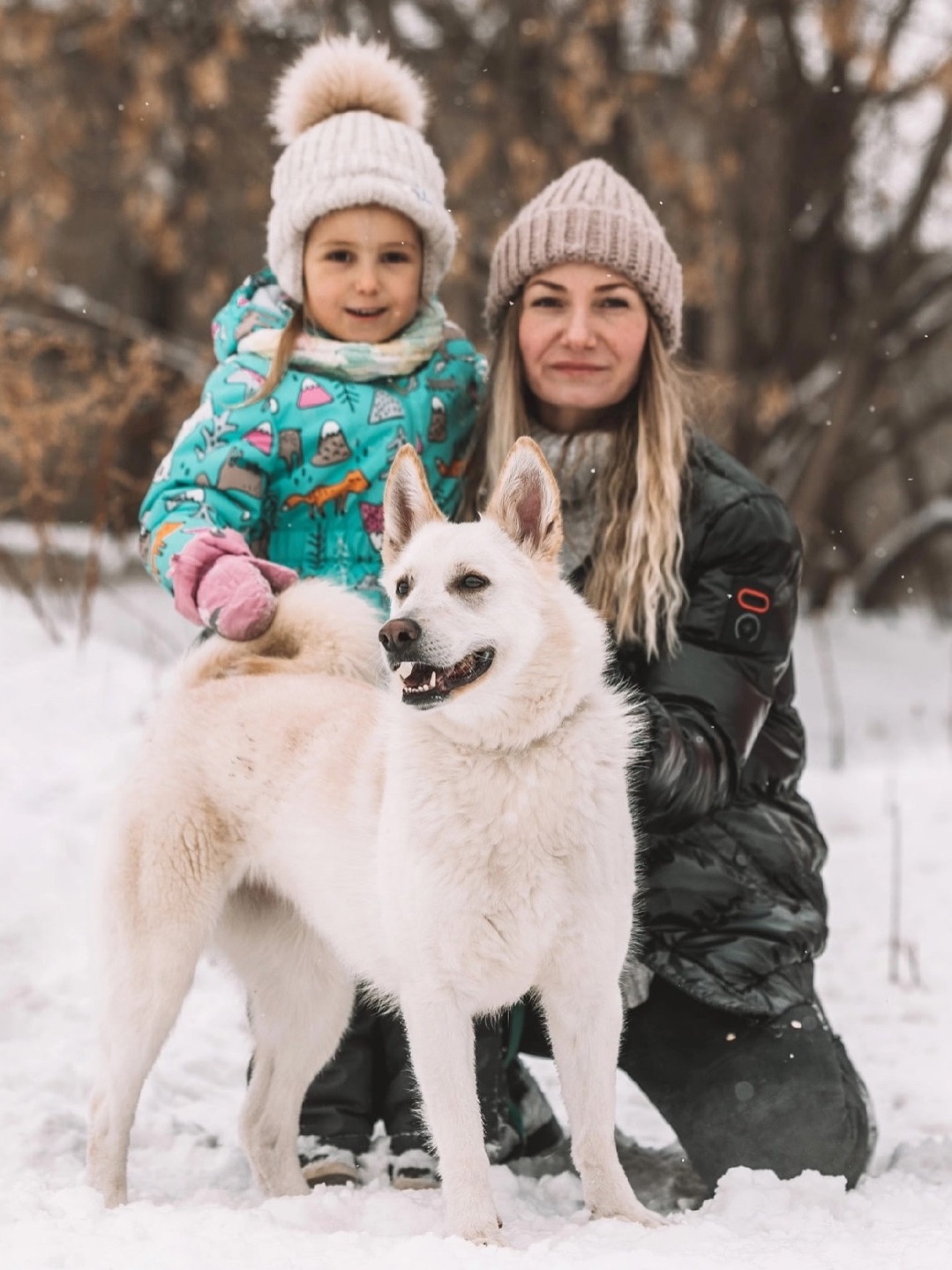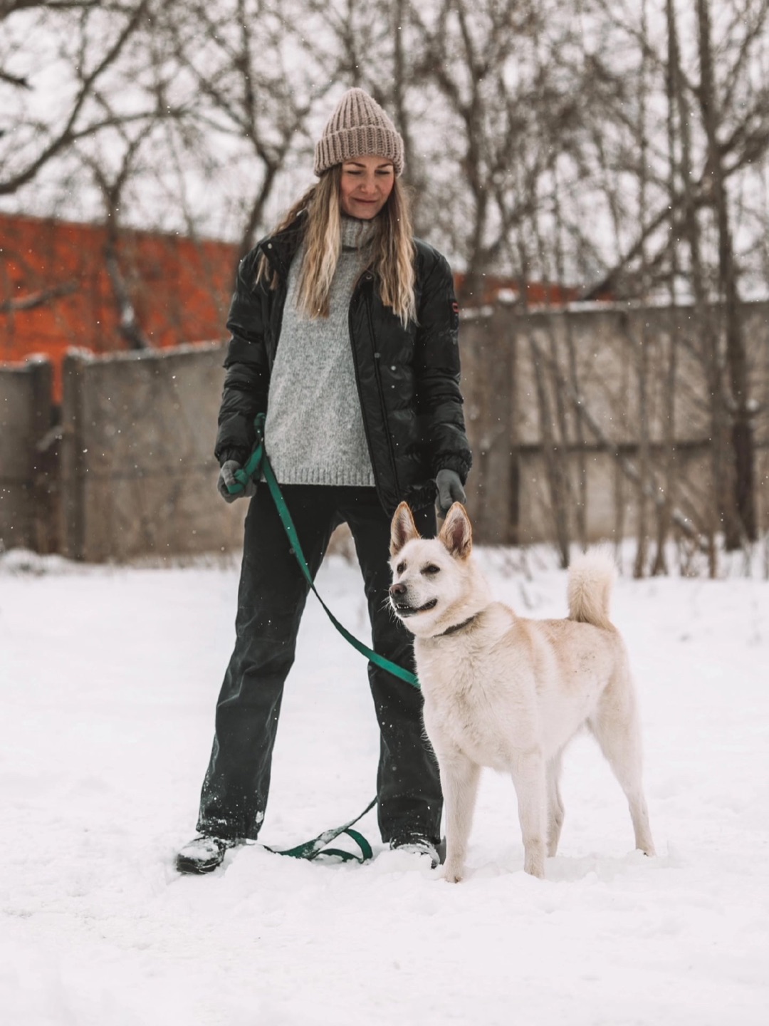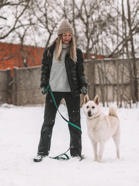 Банни приучена к амуниции, с поводком знакома, но может баловаться и немного тянуть.
